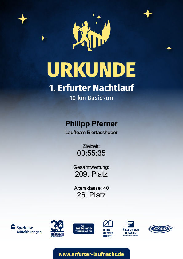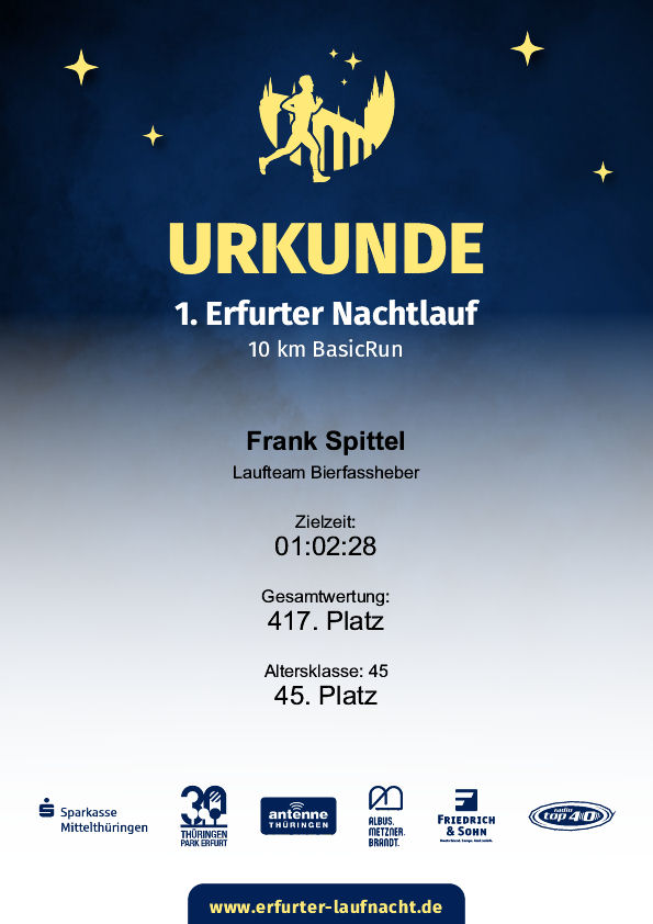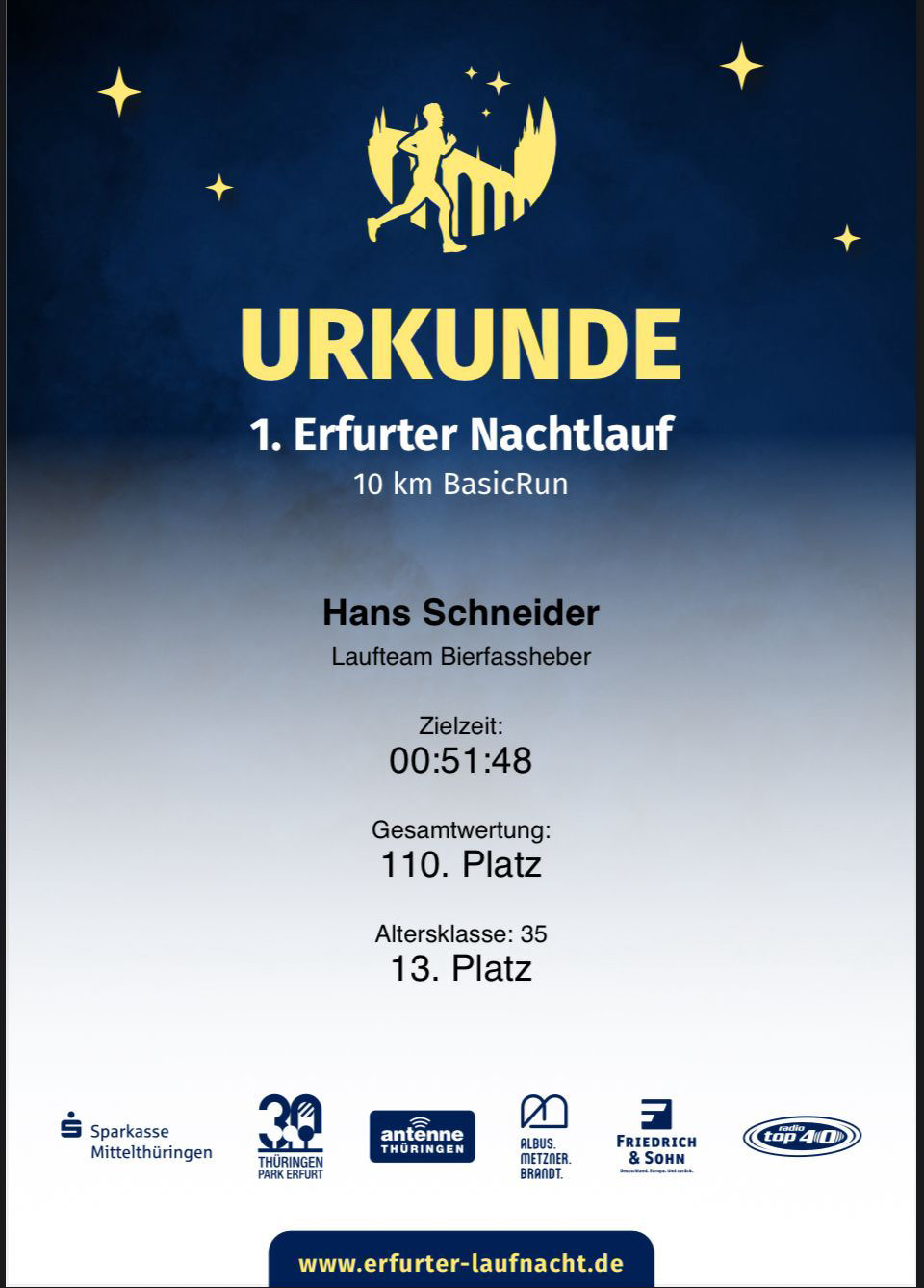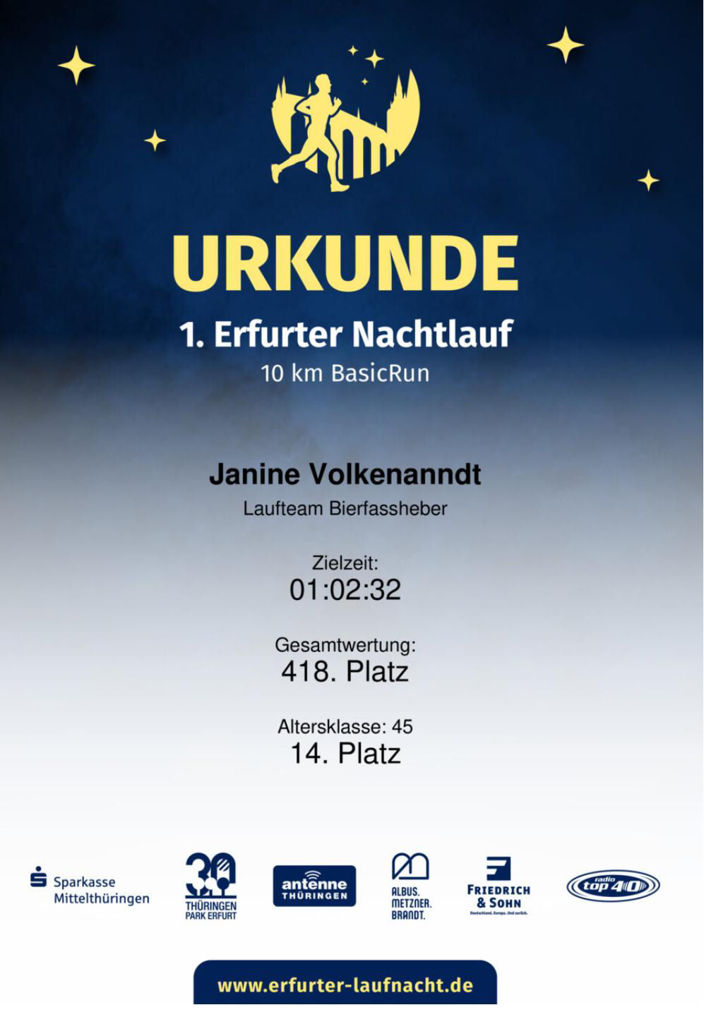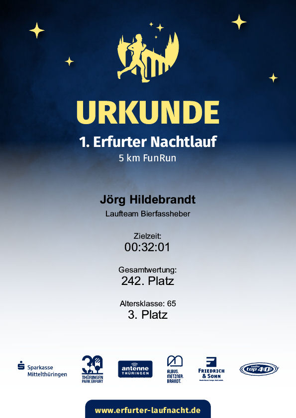 zum diesjährigen Erfurter Nachtlauf haben sich die Sportfreunde Janine Volkenanndt, Frank Spittel sowie Philipp Pferner, Hans Schneider und Jörg Hildebrandt angemeldet.