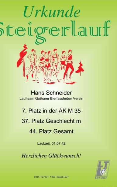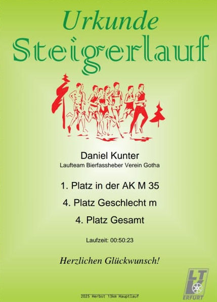 Am Sonntag, den 19.10.2025 fand die 90. Auflage des Erfurter Steigerwaldlaufes statt. Hans Schneider und Daniel Kunter gingen beim Hauptlauf an den Start. Los ging es am späten Vormittag bei 5℃ auf die 13km & 300hm.